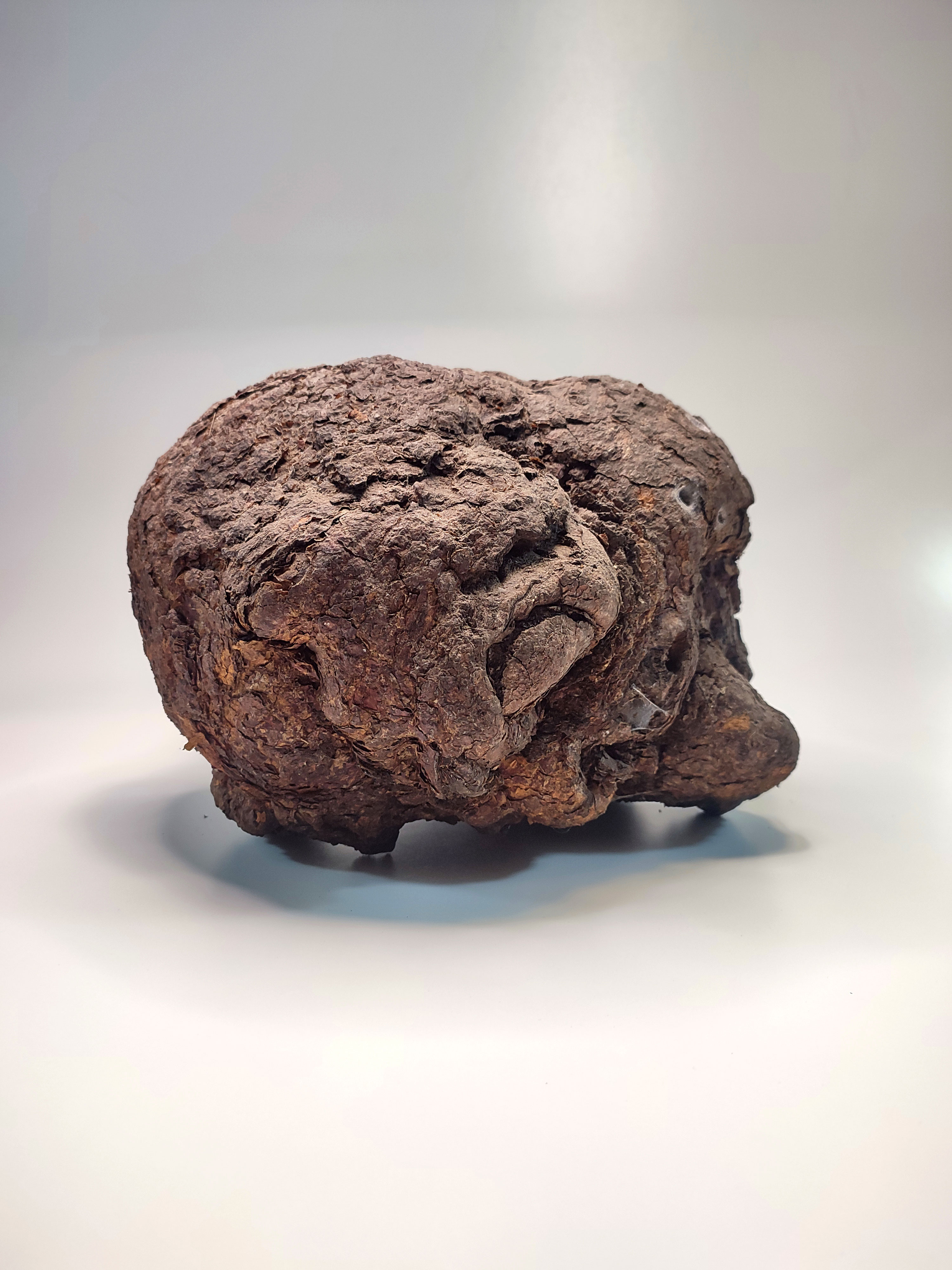 Pieza esférica de textura rugosa y cromatismo ocre. Remite a escultura biomórfica y a reliquia arqueológica: la naturaleza resiste y, al hacerlo, crea forma. Volumen “cerebral” que sugiere un bosque que se piensa a sí mismo.