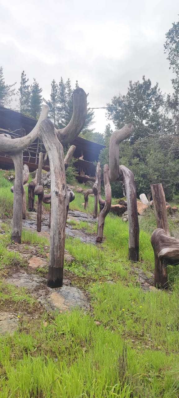 Instalación conformada por un conjunto de troncos de pino radiata curvos, dispuestos verticalmente en la ladera. Cada tronco exhibe torsiones y curvaturas únicas, como cuerpos en movimiento. La superficie ha sido pulida por el artista-curador, revelando la textura y los nudos de la madera. El conjunto se presenta como un bosque detenido, abierto al cielo y al tiempo, en diálogo con el paisaje circundante.